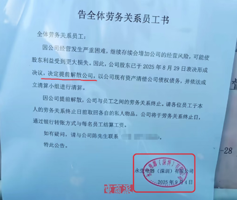同样,最近深圳知名跨境工厂永生电器宣布,因经营严重困难提前解散。公司现有资产除支付劳动报酬外,将用于清偿债权债务。虽然永生电器有自己的品牌,但随着市场竞争升级,其品牌建设与技术投入落于行业趋势,代工业务利润微薄又不足以撑起整个公司。于是,倒闭的噩梦也就来临。