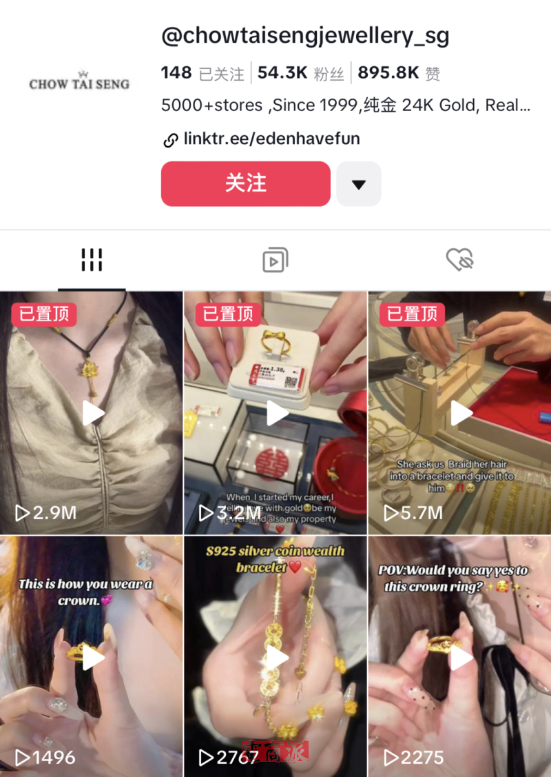 具体来看,在多个TikTok本土账号里,周大生新加坡官号成效最为突出,粉丝量突破5万。其视频内容以高清产品展示和线下门店讲解为主,主要发挥引流作用,将用户导向品牌官网、Telegram、WhatsApp等自主渠道。