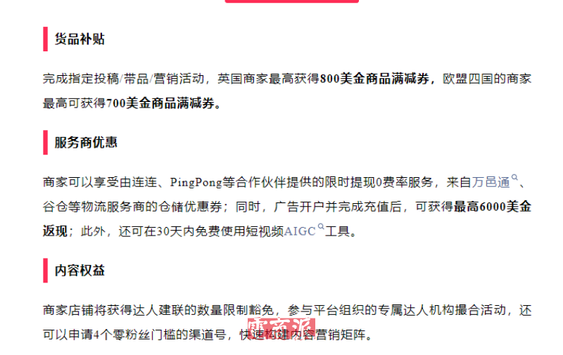 值得一提的是,TikTok Shop为新入驻商家提供丰富的组合权益,针对新商经营痛点提供减佣支持、商品/商城权益、商家内容、营销活动、达人内容、物流补贴、推广扶持、新商培训等多重扶持政策,帮助新商解决店铺经营难题,扶持新商家从0到1实现生意起步。