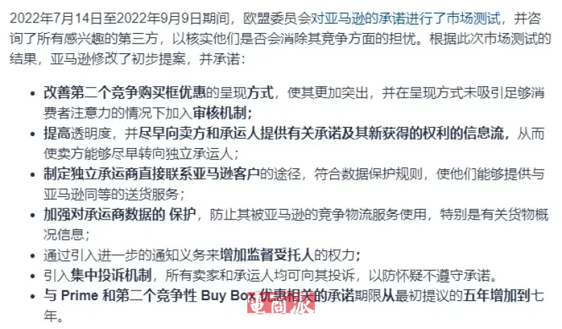 这场审查持续三年时间,最终同样以和解收尾。亚马逊向欧盟委员会提交整改承诺,若违反承诺,欧盟委员会可对其处以全球营业额10%的罚款。