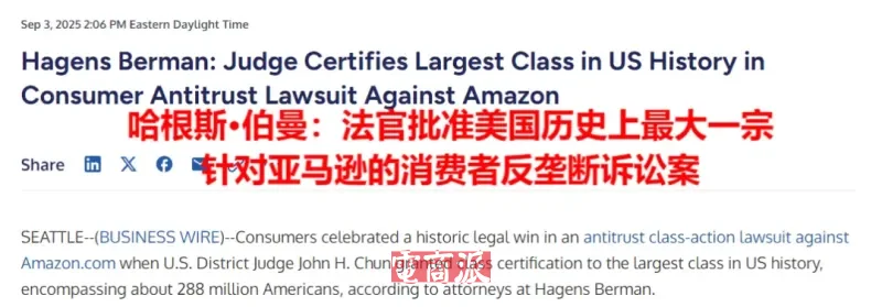 据一位经济专家,诉讼发起人之一透露,亚马逊的这一行为影响了全美大约340亿笔第三方交易、2.88亿消费者。