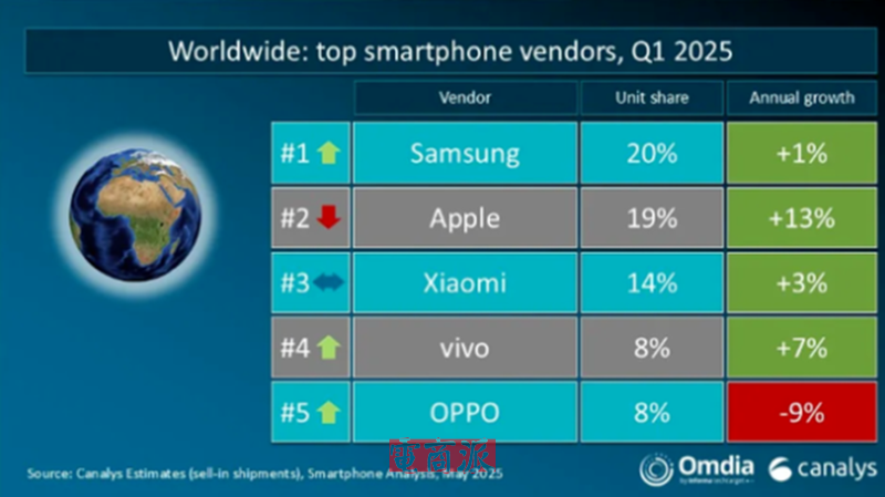 2025年Q1全球手机出货量排行榜 图源:Canalys