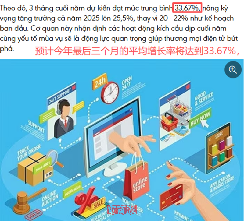 基于这一积极态势,越南工贸部调整了第四季度及全年的电商增长预期,预计第四季度平均增长率将达33.67%,较此前预期提升约8个百分点。同时,2025年全年增长目标也从年初设定的20%–22%上调至25.5%。
