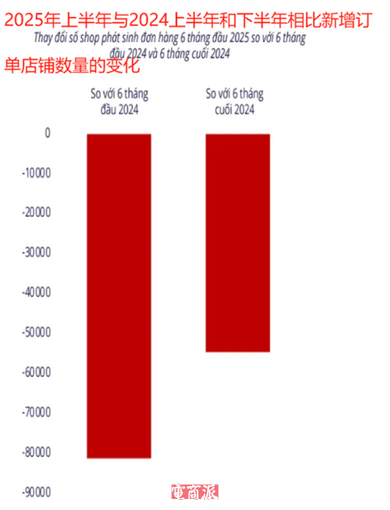 根据智能数据平台Metric发布的2025年上半年在线零售市场概览报告,2025年上半年,越南产生订单的店铺数量大幅减少,与2024年同期相比,有超过8万家网店因没有订单被迫关店;与2024年下半年相比,新增未开单店铺数量也达到5.5万。