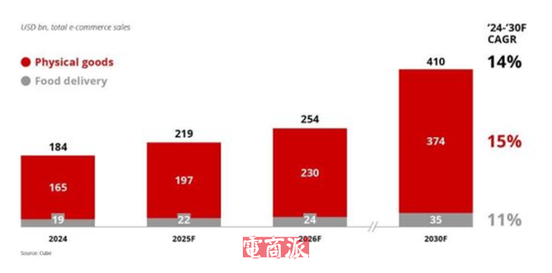 放眼整个区域,东南亚电子商务的增长故事才刚刚开始。《Nextwave东南亚2025》报告指出,预计到2030年,东南亚的电子商务销售额将从2024年的1840亿美元增长一倍以上,达到4100亿美元,在此期间的复合年增长率为14%。