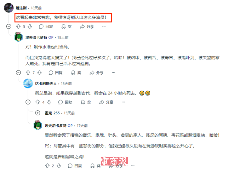 在海外社区平台Reddit,就有中剧爱好者评论道,“这款游戏确实是为我制作的,我很高兴我对C-Dramas(中剧)的了解真的派上了用场。”甚至还有用户表示,游戏里的中国演员,很多都是熟面孔。