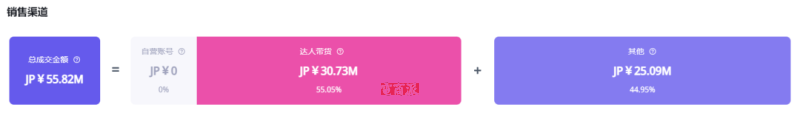 从成交渠道来看,这家小店主要靠达人带货出圈,全店累计5582万日元销售额中,超过一半来自达人带货,剩余部分则由商城商品卡、店铺主页、橱窗、搜索等渠道推动,即短视频和直播以外的所有渠道,自营账号收入为零。