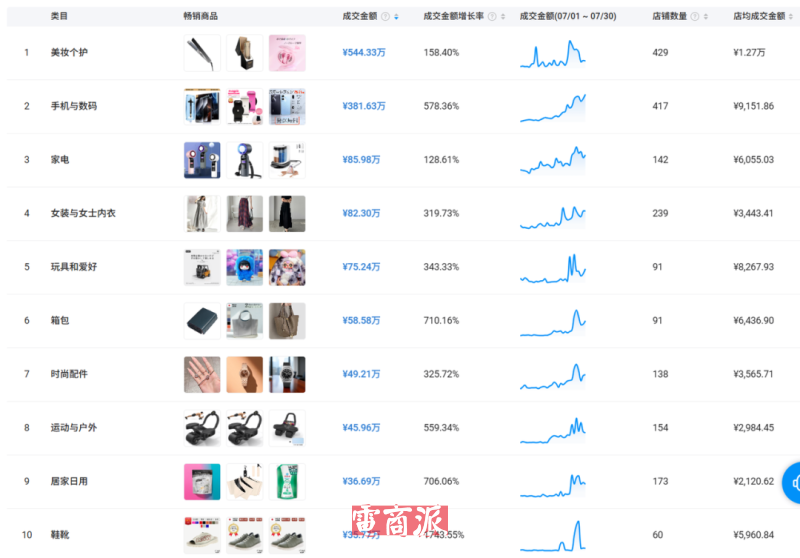 TikTok Shop日本站首月GMV前十大类目 图源:Kalodata