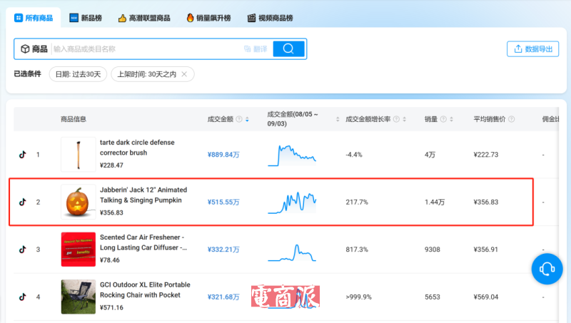 9月,一款和塑料雪人类似的万圣节装饰品,会唱歌说话的动画南瓜也在TikTok掀起消费热潮,在上架短短一个月的时间里,便达成GMV破500万的超强业绩,成为今年万圣节的网红单品。