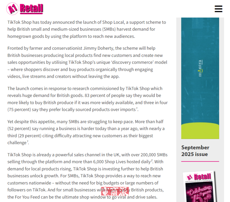 10月15日消息,TikTok Shop宣布,在英国推出名为Shop Local的本地支持计划,投资总额达75万英镑,旨在帮助英国中小型企业(SMBs)通过平台销售更多本地产商品,拓展全国消费者市场。该计划将协助英国本地企业利用TikTok Shop的“发现式电商”模式,通过短视频、直播及创作者内容实现商品的自然曝光与销售。