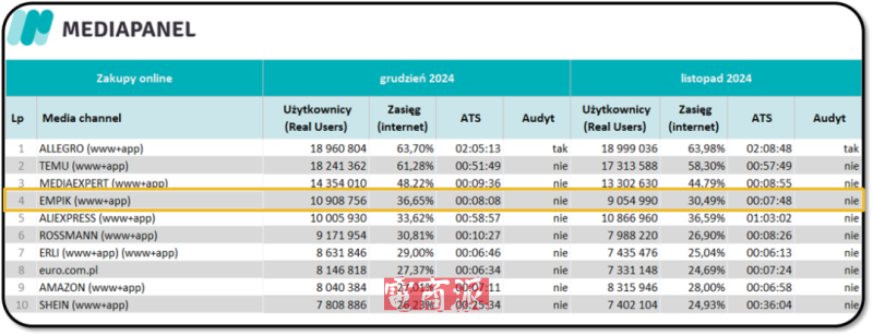 好消息是,Empik在波兰市场的表现还是不错的。据Mediapanel PBI/Gemius 2024年年底数据,2024年Empik已获得初步胜利,成功跻身波兰按实际用户数量排名的最大电商平台前四名。