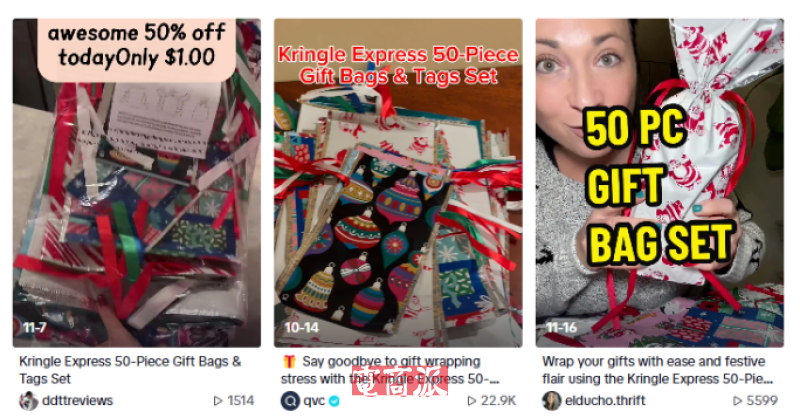 去年初上架时,产品并没有获得太大的关注,日销量长期徘徊在两位数。直到11月圣诞氛围渐浓,QVC联合大量生活类达人集中发力,在视频中实景演示用不同尺寸礼品袋包装红酒、玩具、衣物等场景,直观展现其实用性,才实现销量爆发,日销量一路飞升达到了上千单,推动产品登顶QVC店铺热销TOP1。