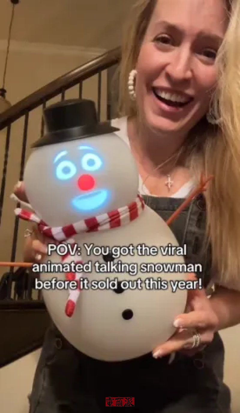 今年圣诞一款上百美元客单价的塑料雪人也同样成为了旺季黑马,该产品通过LED面部投影技术实现会说话、会唱歌、能变换表情的互动效果,各大达人拍摄趣味短视频也备受关注,单条视频最高播放量突破2000万,带动产品迅速跻身TikTok美区家居品类热销榜。