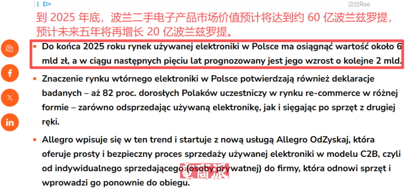 数据显示,到2025年底,波兰二手电子产品市场价值预计将达到约60亿波兰兹罗提,并预计未来5年将再增长20亿波兰兹罗提。