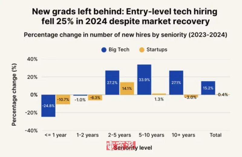 风投机构SignalFire的调研数据显示,2024年,大厂中初级岗位仅占所有新招聘的7%,相比2023年下降了25%。对此,SignalFire合伙人解释称:“AI正在接管过去由实习生和初级员工完成的工作。”
