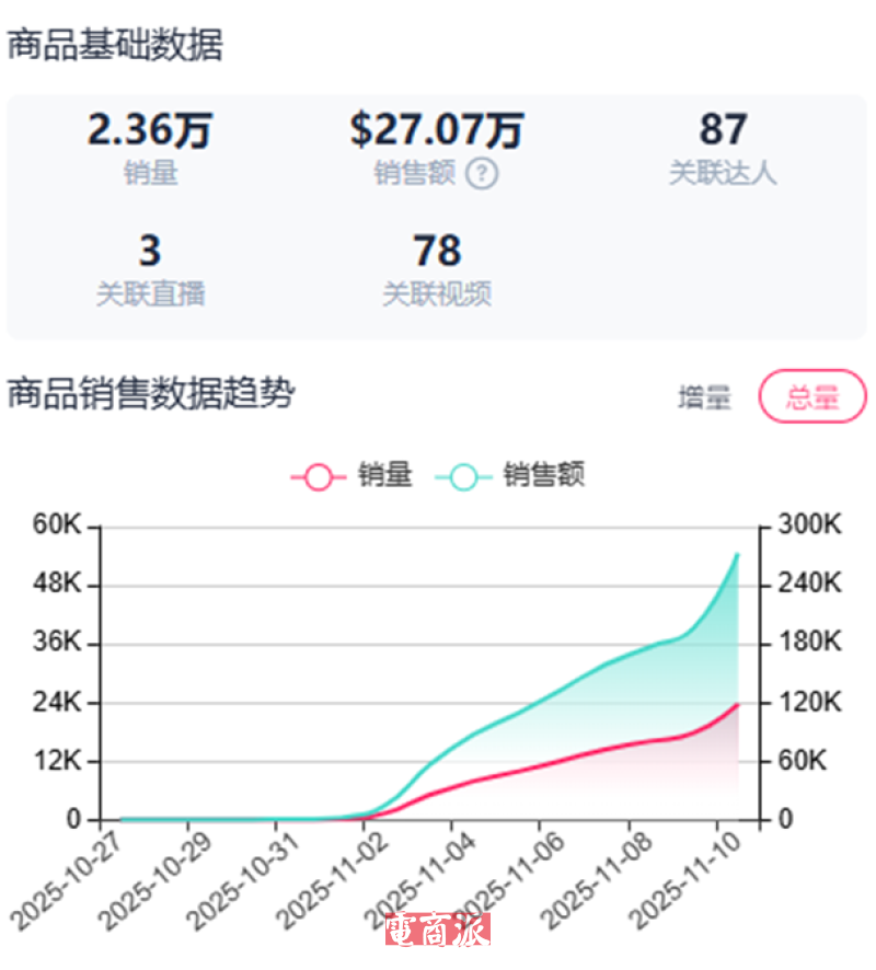 从销售额来看,自上架以来,该产品已经累计达成销售额27.07万美元(约合人民币192.72万元),目前其销售增量和总量都呈现直线上升态势,预计未来较长一段时间内还将保持加速增长。