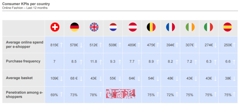 相比之下,英国消费者购买频次达11.8 次,但平均订单金额仅43 欧元,透露出该国市场以快时尚及平价消费为主的特性。