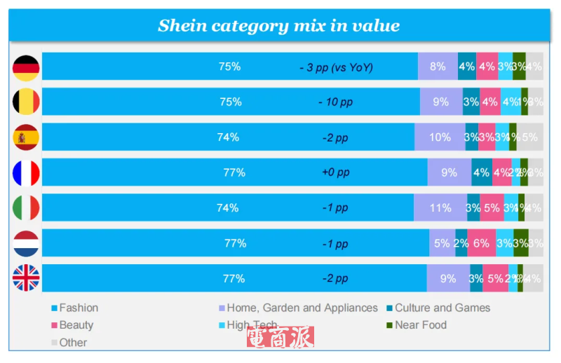 其中SHEIN在过去12个月中,Shein的市场份额显著上升,在德国、英国、荷兰、意大利等国均跻身前三,增幅最高达3%;Temu则通过极具竞争力的价格策略和高频营销,在西班牙等南欧市场实现快速增长,增幅达到2.3%。