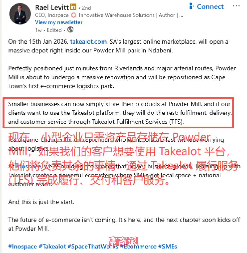 对此,Inospace首席执行官Rael Levitt在LinkedIn帖子中表示:“现在,小型企业只需将产品存储在 Powder Mill,如果我们的客户想要使用 Takealot 平台,他们将负责其余的事情:通过Takealot 履行服务 (TFS) 完成履行、交付和客户服务。”简单来说,这一合作模式将显著降低中小企业的物流门槛。