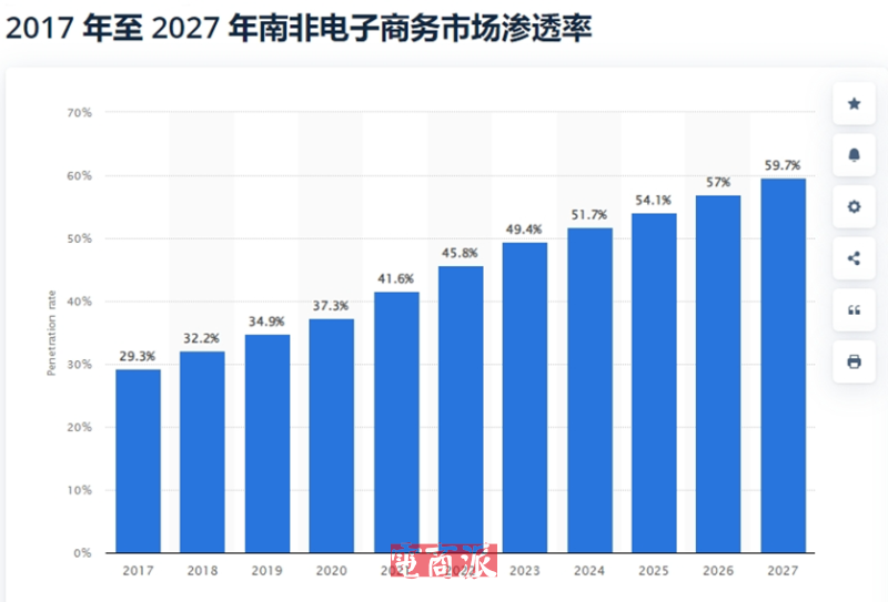 更重要的是,随着互联网的普及和电商平台的涌现,南非电商市场正在经历快速增长。很早之前Statista发布的一份报告就指出,预计2023年至2027年间,南非电商市场的渗透率将增加10.3个百分点,并在2027年达到59.7%的峰值。