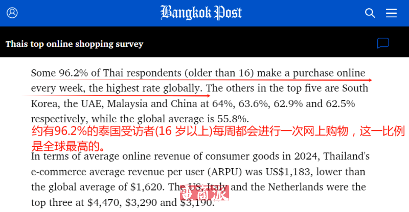 全球营销平台We Are Socia曾发布一项调查数据显示,泰国在全球网购及移动应用消费领域稳居前列,超过九成(96.2%)的16岁以上消费者每周至少网购一次,这一比例远超全球平均水平(55.8%)。