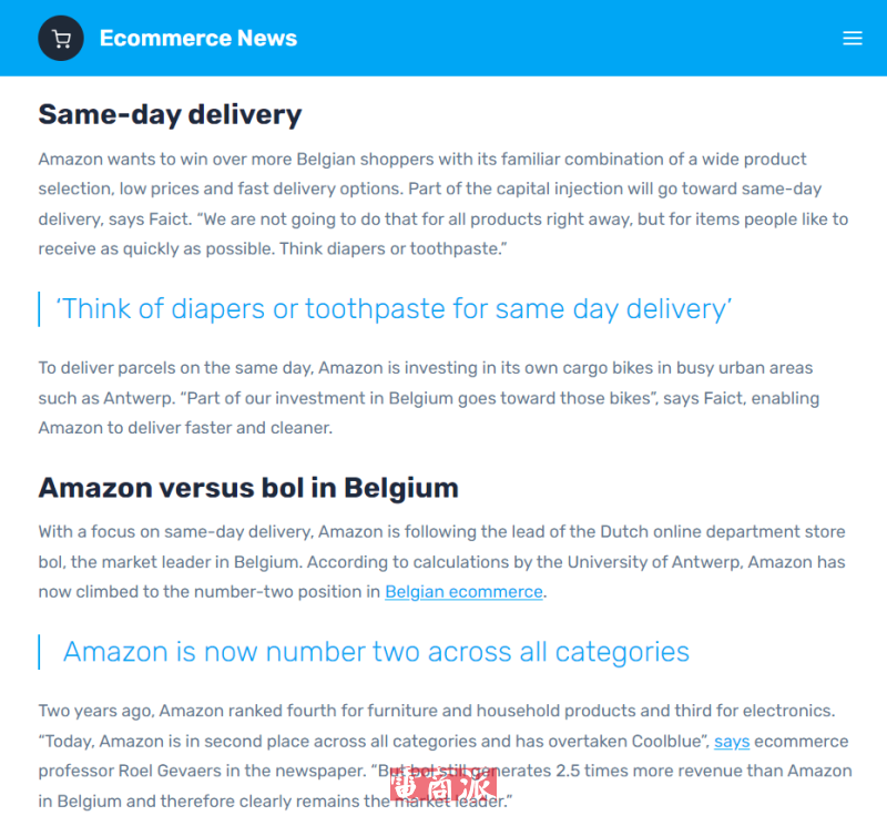 11月22日消息,亚马逊推出比利时站点仅三年,已成长为该国第二大在线电商平台。市场份额方面,安特卫普大学的计算显示,两年前,亚马逊在家具和家居用品领域排名第四,电子产品领域排名第三。如今,亚马逊在比利时所有品类中都位居第二,并已超越本土竞争对手Coolblue。荷兰电商平台bol仍然保持领先,其营收约为亚马逊在比利时营收的2.5倍,稳居市场首位。