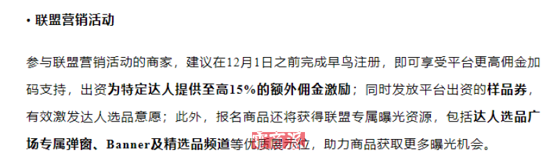 在“内容场”方面,本次年终促激励力度拉齐黑五,重点关注超级直播间大场冲刺、短视频激励、机构直播激励、商家玩法。针对商家侧,佣金共资机制整合平台资源,定向圈选高等级达人加佣,加佣比例高于日常加佣至少3%,联盟七天一周期灵活调整加佣,机构12月全月加佣在线,保障促前内容蓄水与促间优质内容持续产出;建议商家在12月2日前完成报名。