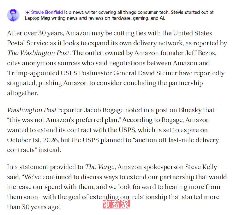 根据公开数据,USPS在2025年的总营收中约7.5%来自亚马逊,金额达到60亿美元。长期以来,虽然USPS依赖包裹业务弥补传统信件业务的营收下滑。但过去十年中,USPS有九年的年度亏损达数十亿美元,2025财年的亏损额更是达到90亿美元。若失去亚马逊这一最大客户,USPS的运营压力将显著加剧。