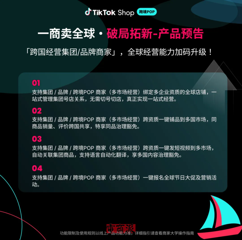 此外,TikTok Shop官方表示,“一商卖全球”项目将于2026年2月上线更多功能,包括同账号绑定多企业资质的全球店铺,跨资质发布视频和铺品到多站点、一键报名全球节日大促和营销活动等,为跨区域、跨主体、全球经营的多店商家提供从“店铺管理”到“全域增长”的全周期支持。