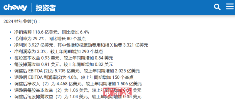 据Chewy财报,2024财年Chewy总营收达到118.6亿美元,净利润达3.927亿美元。该财年里,Chewy净增活跃用户达43.1万,整体用户规模超过2000万。