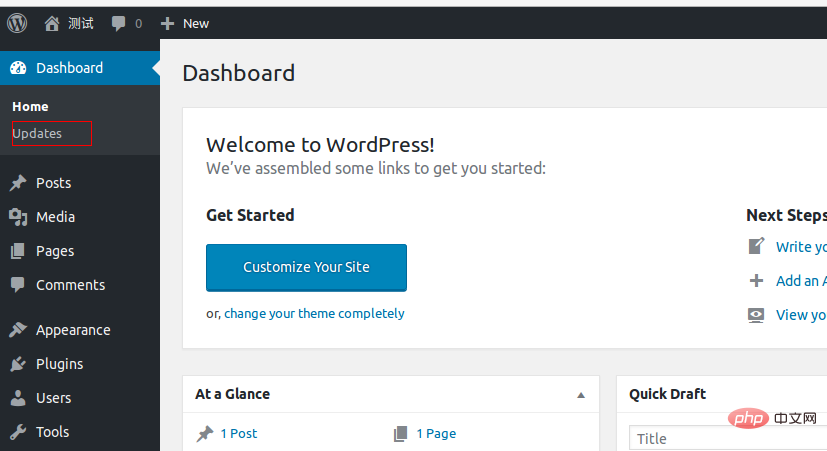 2、进入站点控制板(dashboard),看到更新提示后进行升级即可。WordPress会自动从官方网站下载中文语言包并安装。