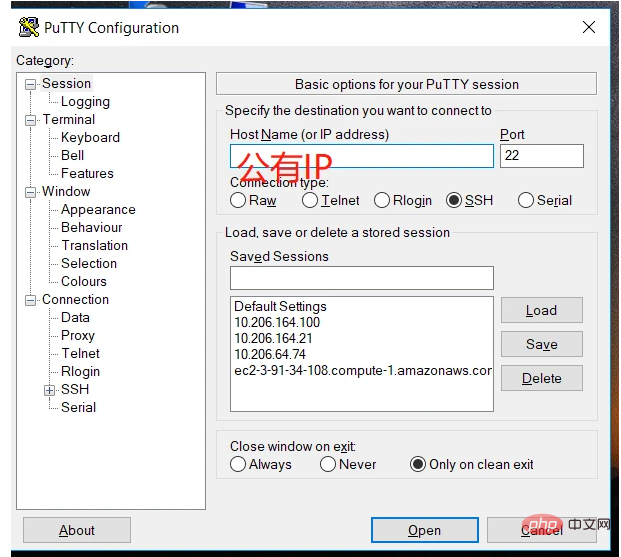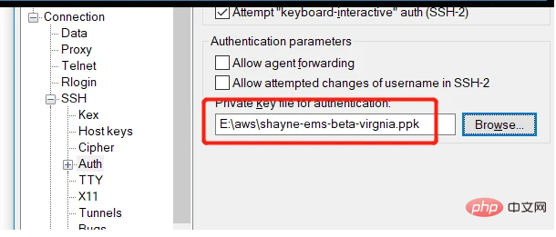 主机名称填EC2的公有IP地址,连接类型SSH。然后点击菜单“连接”—“SSH”–“认证”,选择刚才转换后的PPK格式认证私钥文件。
