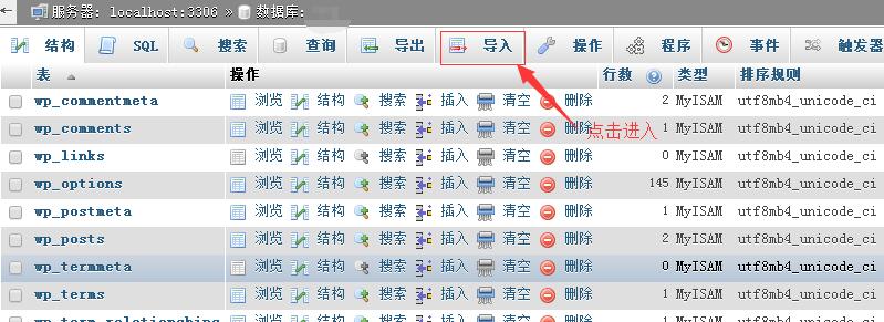 3、进入之后选择需要导入数据库的网站,并点击;之后在右上方找到导入按钮;