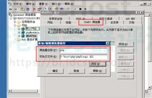 (4)返回网站“属性”界面,点击“ISAPI筛选器”,添加可执行文件目录:通过浏览找到php目录下的php5isapi.dll文件。然后点击“确定”即可。