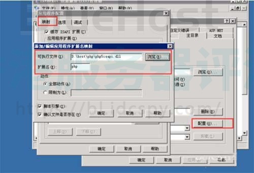 (3)主目录界面点击“配置”——》“映射”——》“添加”,可执行文件:点击浏览找到php目录下的php5isapi.dll文件;扩展名填写为:PHP。