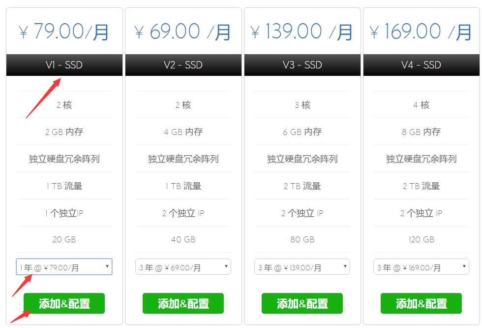 2.在BlueHost VPS产品页面选择方案和购买年限,需要注意的是这次半价活动是只有购买年付方案SSD VPS才可以享受半价优惠,所以这里以V1-SSD方案年付为例,选择好点击“添加&配置”进入下一个页面:
