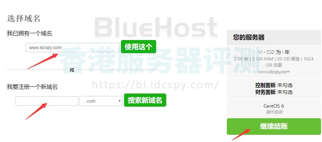 4.在选择域名页面填写域名,如果你有域名直接输入域名;如果你没有域名可以注册一个域名。这里以有域名为例,填写好域名点击“继续结账”进入下一个页面: