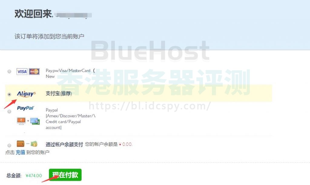 7.在支付方式页面选择支付方式,目前提供VISA、PayPal、支付宝和账号余额四种方式,一般建议选择支付宝,点击“现在付款”按钮。