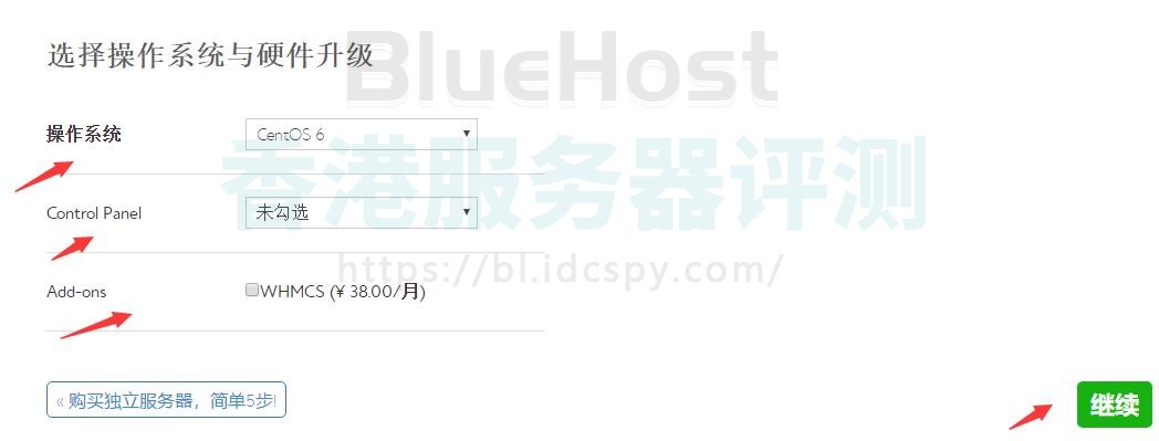 3.在下图页面选择操作系统和硬件升级,这里提供五种操作系统和三种控制面板,这个根据自身建站需求来选择就可以,选择好后点击“继续”进入下一个页面:
