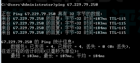 合肥电信Ping值测试,184ms左右,无丢包:
