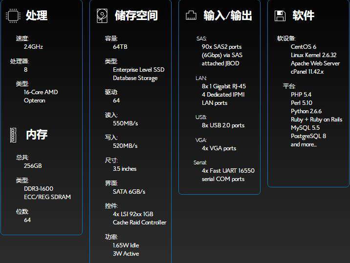 在BlueHost中文站了解到,BlueHost服务器采用双E5530 2.40GHz至强四核超线程处理器、24GB内存、250GB RAID 1 (镜像) OS驱动、1 TB RAID 1 (镜像) 客户数据缓存驱动器、电池支持,所有驱动均有RAID控制器、冗余电源, 高压交流电和火灾监测系统。而且支持PHP 5.2, 5.3x, 5.4x, Perl, Python, RoR, GD, cURL, CGI, mcrypt、Apache 2.2x、MySQL 5、Ruby On Rails、Zend Optimizer, Zend Engine, ionCube Loader等程序。