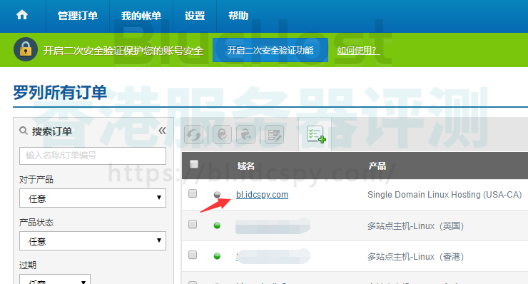 1、首选登录BlueHost控制面板,点击导航栏管理订单-罗列/搜索所有订单,如下图所示: