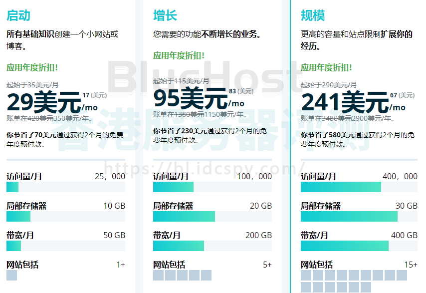 BlueHost主机包括Windows和Linux操作系统,一共有Plan A、Plan B和Plan C三种方案。BlueHost的Plan B和C方案支持无限流量和无限空间且不限制网站建设数量,三种方案现在使用BlueHost优惠码可以享受30%优惠,配置低的Plan A方案优惠后只需25元/月,具体参数如下图所示: