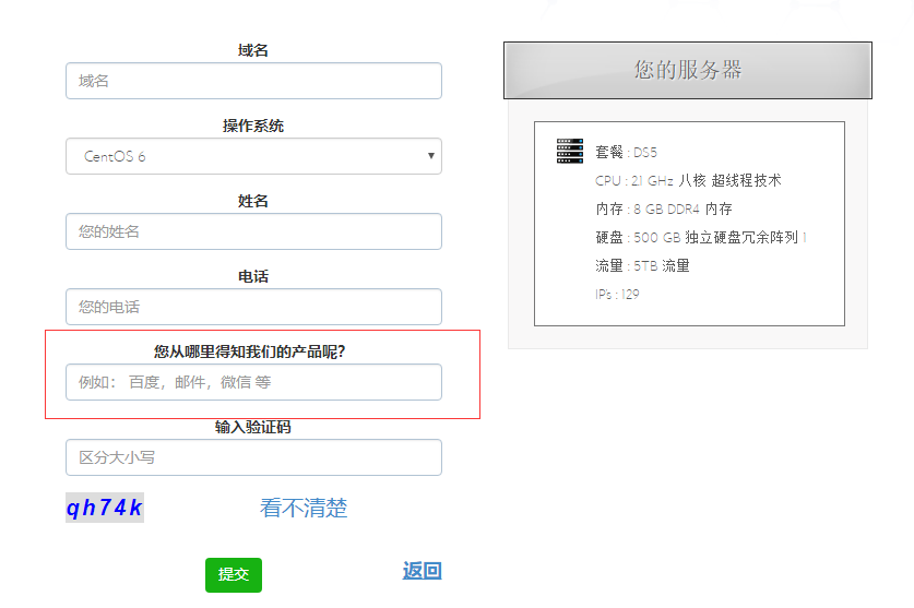 4、在下图页面填写域名、操作系统、姓名、电话和验证码,操作系统根据自身建站需求来选择就可以,填写好后点击“提交”进入下一个页面;