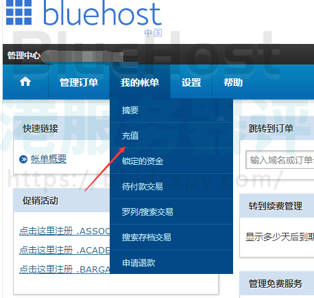 6、进入后台管理中心,在“我的账单”下面找到“充值”点击进去,如下图所示;