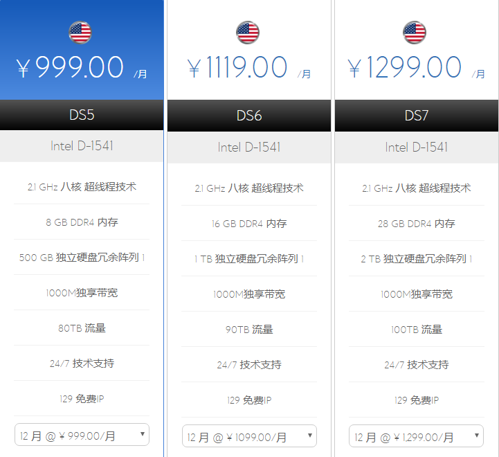 2、在产品页面选择数据中心、方案和购买年限,选择好点击“添加&配置”进入下一个页面,这里以美国机房为例;