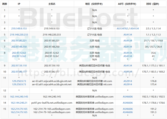 这里我们参考在线IPIP Ping工具测试全球节点Ping速度,从图片我们可以看到晚上测试Bluehost美国SSD服务器速度还是比较快的,毕竟晚上国内速度能平均到200MS内算是表现很好的。