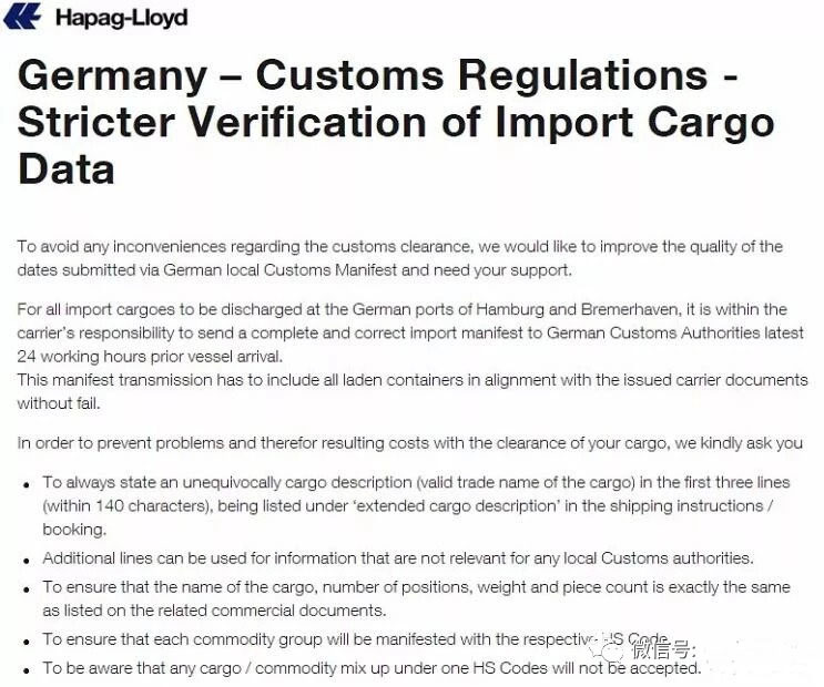 船公司表示,对于所有在德国汉堡港(Hamburg)和布莱梅港(Bremerhaven)卸货的进口货物,承运人有责任在船舶抵达前的24个工作小时向德国海关当局发送完整和正确的进口舱单。