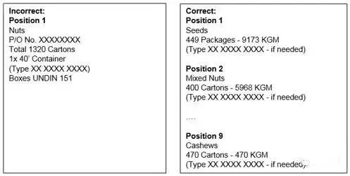 确保货物的名称、位置、重量和件数与相关商业单据上的列出完全一致。