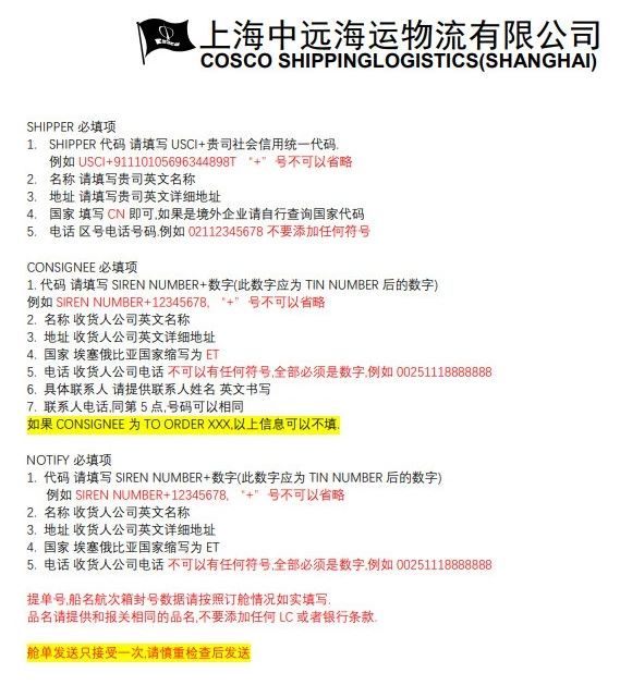 据百运网了解,近日中远海运中船公司发出通知称,出口埃塞俄比亚发送新舱单有新要求:新舱单务必以船名航次+订舱号+新舱单格式发送,新舱单要以单独的邮件形式发送,不要和提单确认等文件混淆。
